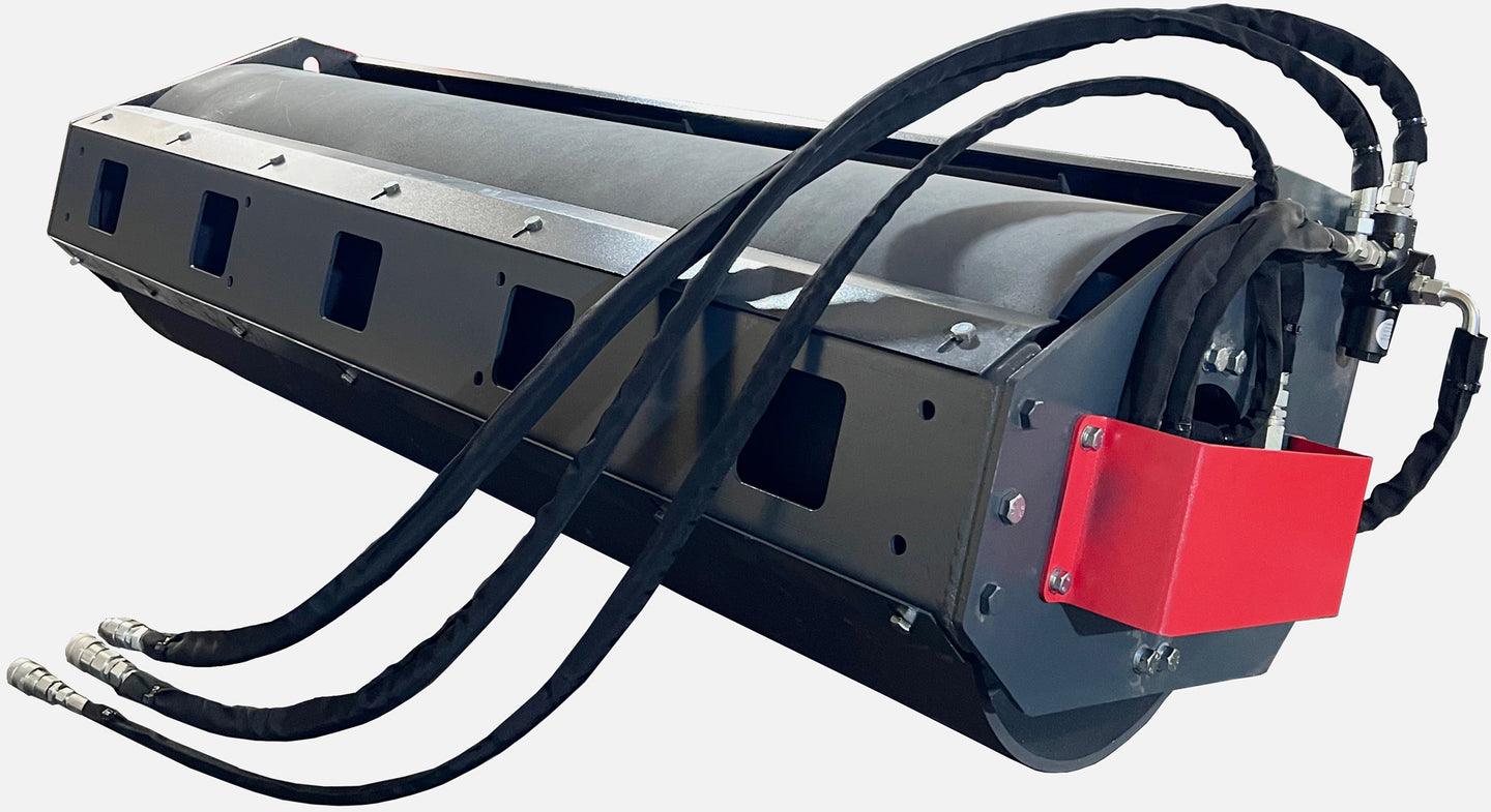 This Skid Steer Vibratory Roller is designed to attach to skid steer to compact concrete, soil, gravel, or asphalt in the roads or foundations of landscaping, roadways, walkways, golf courses, and parking lots. This part sometimes is called roller-compactor, or road roller. This vibratory roller is taking advantage of its own heavyweight skid steer plus the attachment to compress the surface.