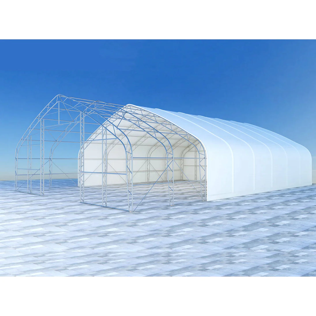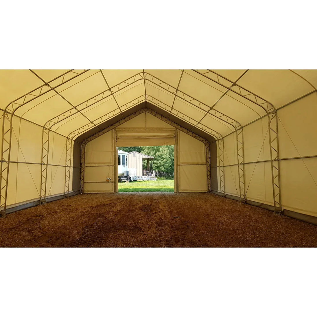 Storage Shelter W50’xL80’xH26’ - Double Truss 22oz PVC is a must-have item for storage and protection. It is ideal for agriculture, farms, automobile storage, entertainment tents, events, temporary shelters, film sets, or even parties. The steel construction is tested to stand under up to 50 miles per hour wind load, scorching sun, heavy snow, and even the toughest weather conditions in North America. If you are looking for something to cover and protect your cars, boats, RV’s, buses, campers, equipment, tools, materials, supplies, or anything, this double Truss Storage Shelter is a perfect solution.